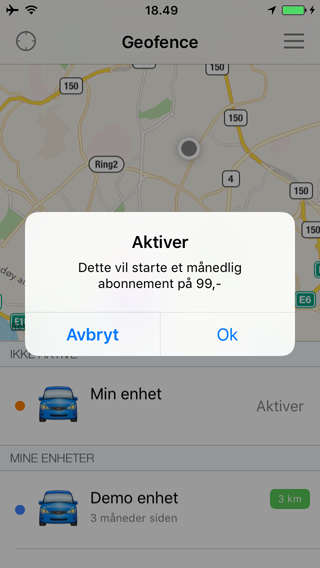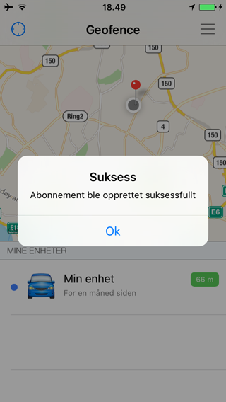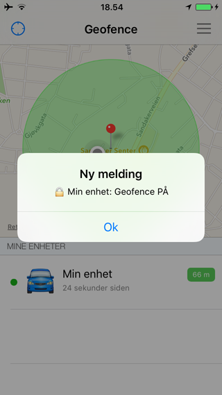 For å sette geofence på trykk på meny valget "Sett geofence PÅ". Mobil applikasjonen tar da kontakt med geofence systemet for å sette geofence på for valgt enhet. Når aktiveringen av geofence er vellykket vil du få en melding om at geofence er skrudd på.