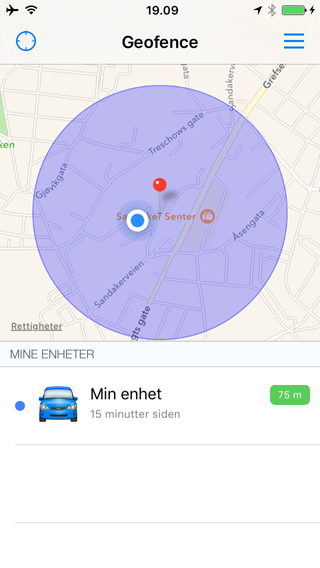 Når det har gått over 5 minutter siden forrige kontakt med enheten vises geofence ringen som en blå ring.