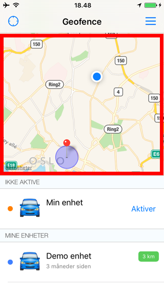 Hvis det er første gang du ser mobil applikasjonen vil du se 2 lister. En over inaktive enheter og en med en demo enhet. Listen inneholder informasjon om hvilket navn som er satt på GPS-enheten, hvor lenge siden enheten sist var i kontakt med systemet og hvor langt unna nåverende posisjon enheten befinner seg. For å aktivere en enhet trykker du på "Aktiver" knappen på for den aktuelle enheten.
