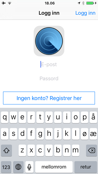 Når du har logget inn på mobil applikasjonen vil du se et kart med en blå og rund indikator for hvor du og mobiltelefonen befinner seg.